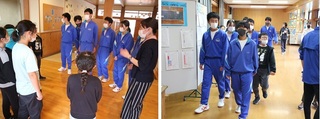 はじめに児童玄関で、小学5年生と中学生が開始のあいさつを交わしました。その後、小学生と中学生が一緒になって校内を1周し、昼休みで遊んでいる子どもたちに「こんにちは」を声を掛けていきました。