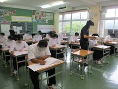 今回の定期テストでは、国語・数学・英語・理科・社会の5教科が一日で実施されるというハードなスケジュールでしたが、生徒たちは最後まで集中力を切らさず、真剣な表情で問題に取り組んでいました。緊張感の中にも一人ひとりの努力が感じられる時間となりました。 ある3年生の生徒は「社会の問題は、資料が多かったけれどしっかり考えれば分かる問題が多かった。」と話してくれました。