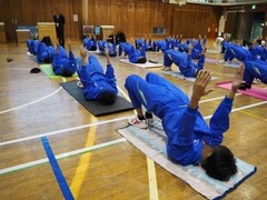 生徒はヨガマットを持参し、学習の合間にできるストレッチを体験しました。多くの保護者の方にもご参加いただき、体育館では生徒・保護者・職員が一緒にストレッチを行いました。外で体を動かしにくくなる季節ですが、今回学んだことを生かし、家庭でもストレッチを取り入れて健康的な生活を送りましょう。